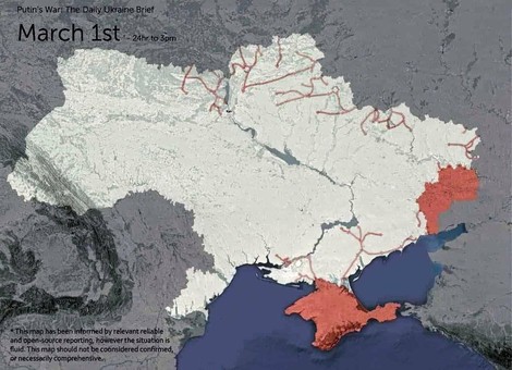 Here is the status of their progress for Mar 1. No new territories are being controlled by Russians - they keep pushing along the roads where they get fierce resistance. Putin has already failed.