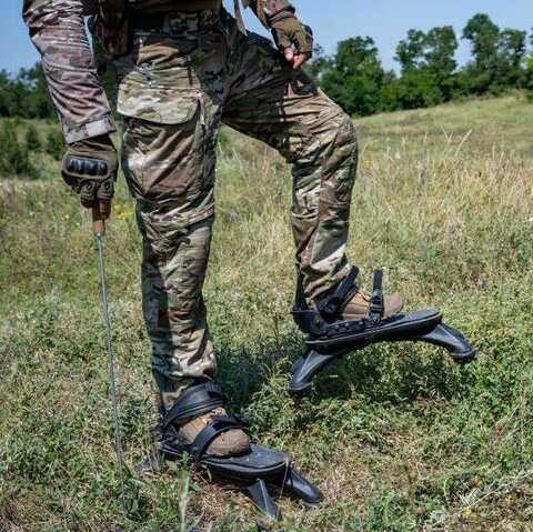 Ženista 128. horské útočné brigády v minám odolné obuvi ukrajinské konstrukce.