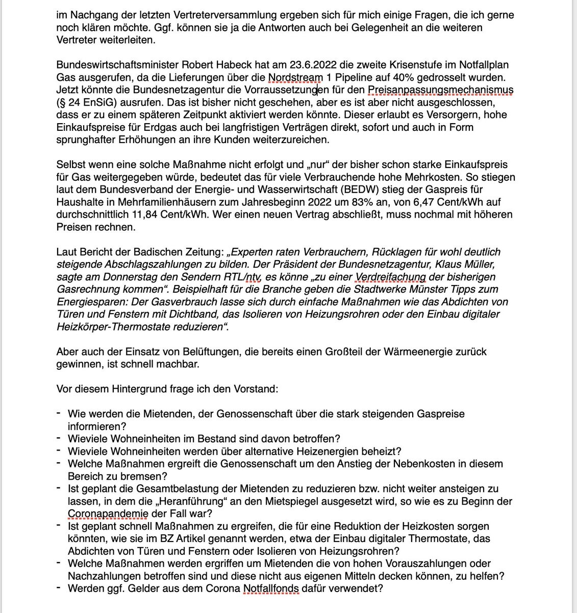 Heute Artikel in der BZ: https://www.badische-zeitung.de/freiburger-mieter-sollen-freiwillig-die-nebenkosten-abschlaege-erhoehen deutliche Unterschiede in der Vorbereitung. Während Familienheim alle anschreibt & meine Fragen beantwortete, lief beim Bauverein bisher wenig. Meine Fragen wurden nicht beantwortet.