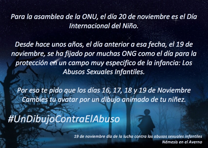 Cambio mi avatar porque para la asamblea de la ONU, el día 20 de noviembre es el Día Internacional del Niño y, desde hace unos años, el día anterior a esa fecha, el 19 de noviembre, se ha fijado por muchas ONG como el día para la protección contra los Abusos Sexuales Infantiles.
