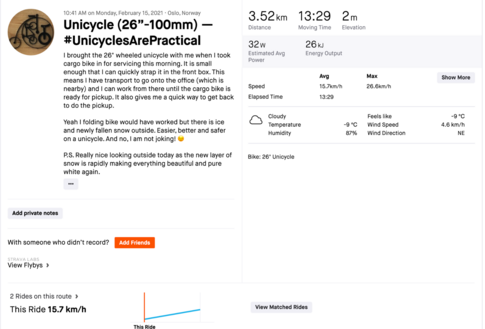 Note my average speed, riding the uni (in the snow) is 15.7km/h. Not fast (since it is a relatively small wheel) but not terribly slow either.