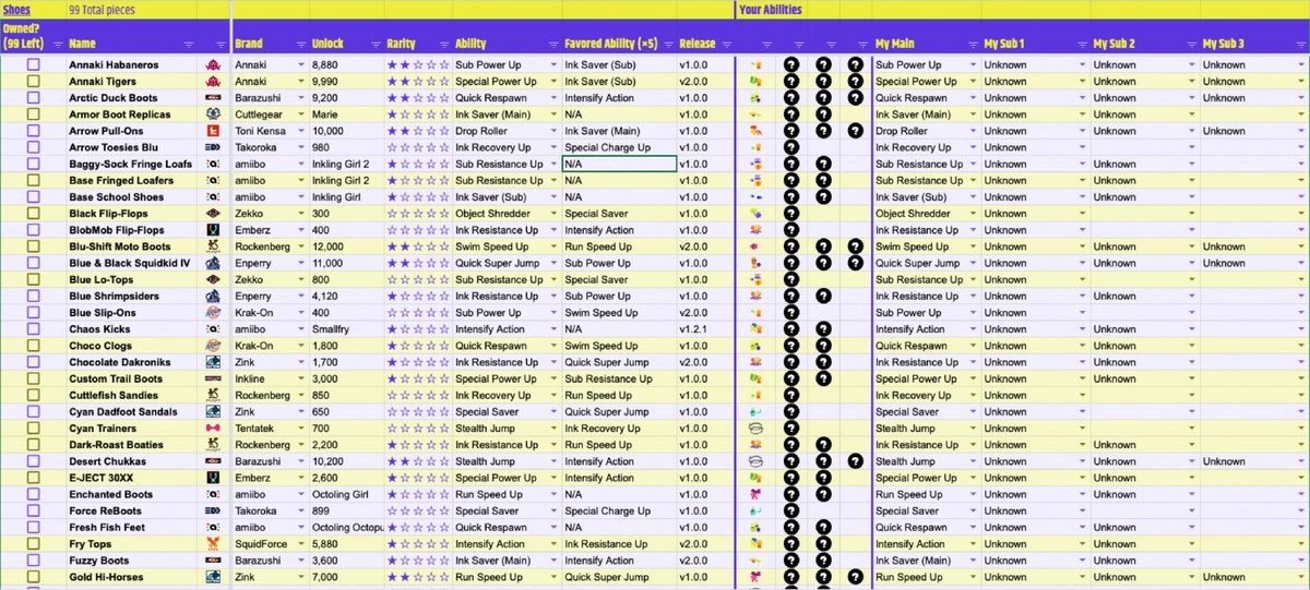Built off of data from https://splatoonwiki.org, this sheet serves as a checklist for gear (including you…