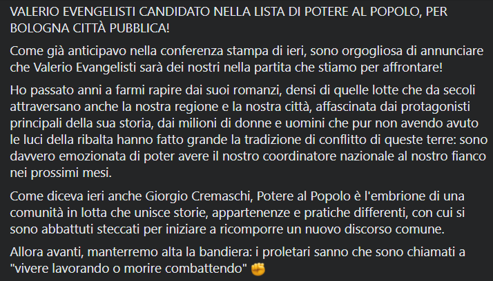 Un compagno che c’era sempre, dalle qualità intellettuali e morali straordinarie. Poche settimane fa ci siamo confrontati su @contropiano sulla guerra. Grazie di tutto #ValerioEvangelisti