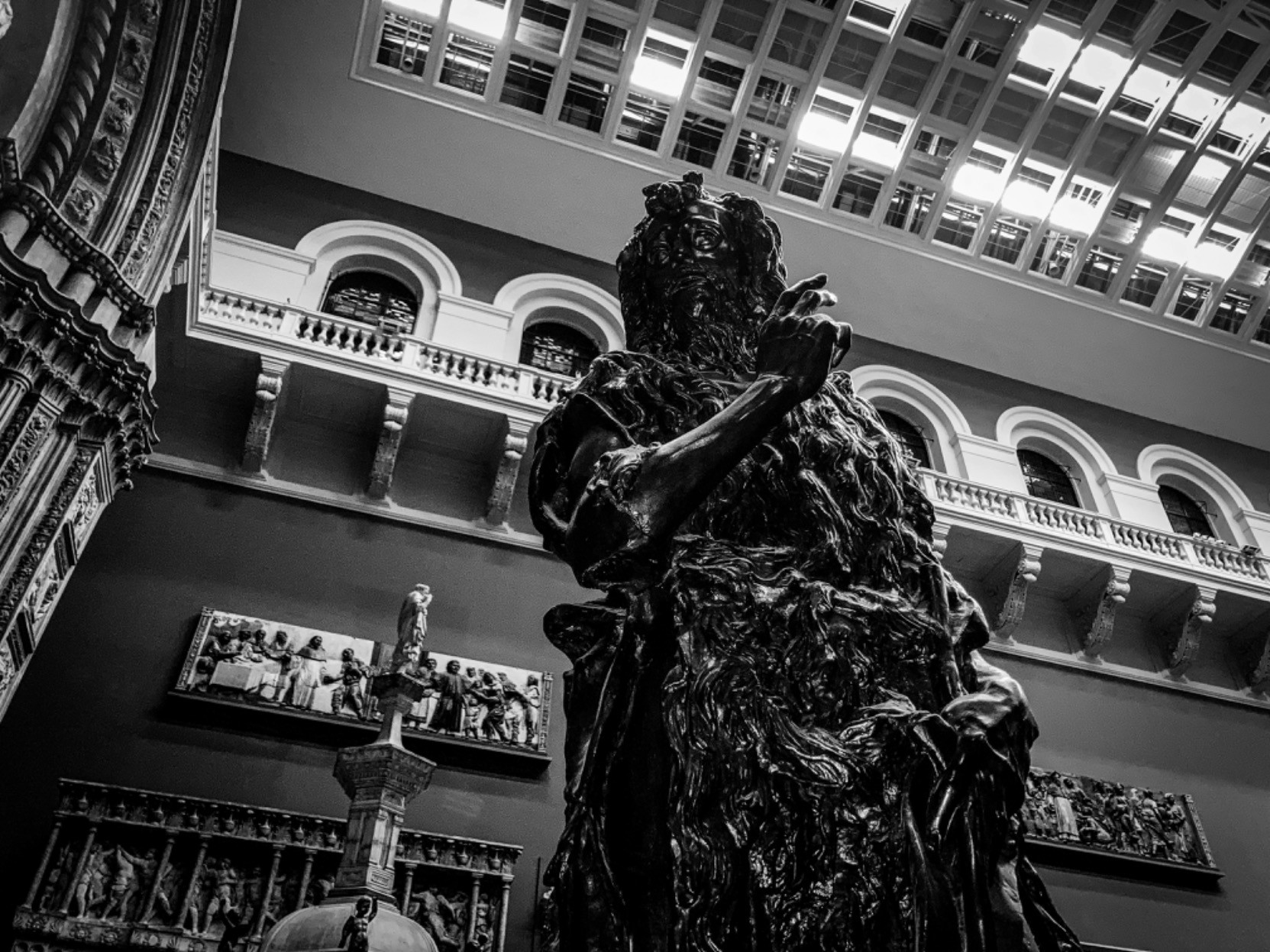 I went to the Victoria and Albert museum with a sketchbook, but came away with some dramatic photographs of the sculpture galleries instead. This is in the Cast Court which is an amazing place, full of plaster casts. Terrible lighting for this, taken after dark with an iPhone - flash just made matters worse - but there's something I like about the barely-discernible features and the shaggy garment he's wearing.