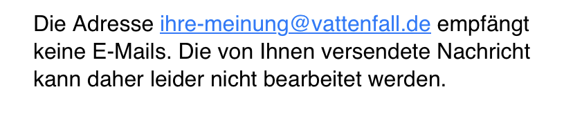 Wer sich diese Adresse fĂŒr noreply ausgedacht hat kann froh sein, dass ich zu weit weg bin, um ihnen MEINE Meinung ins Gesicht zu blasen #vattenfail