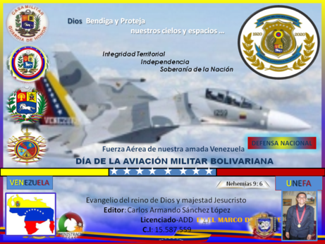 @Nicolas_Maduro Ejerciendo mi profesión como editor comunicacional. Y Lcdo.ADD-UNEFA. Carlos Armando Sánchez López. Me uno a la conmemoración de los 100 aniversarios del Día de la Aviación Militar Bolivariana. Fuerza Aérea de nuestra amada Venezuela. Integridad territorial, Independencia y soberanía de la Nación. Dios Bendiga y Proteja nuestros cielos y espacios. Nehemías 9:6. Defensa Nacional. ✍️ ✈️ 🇻🇪