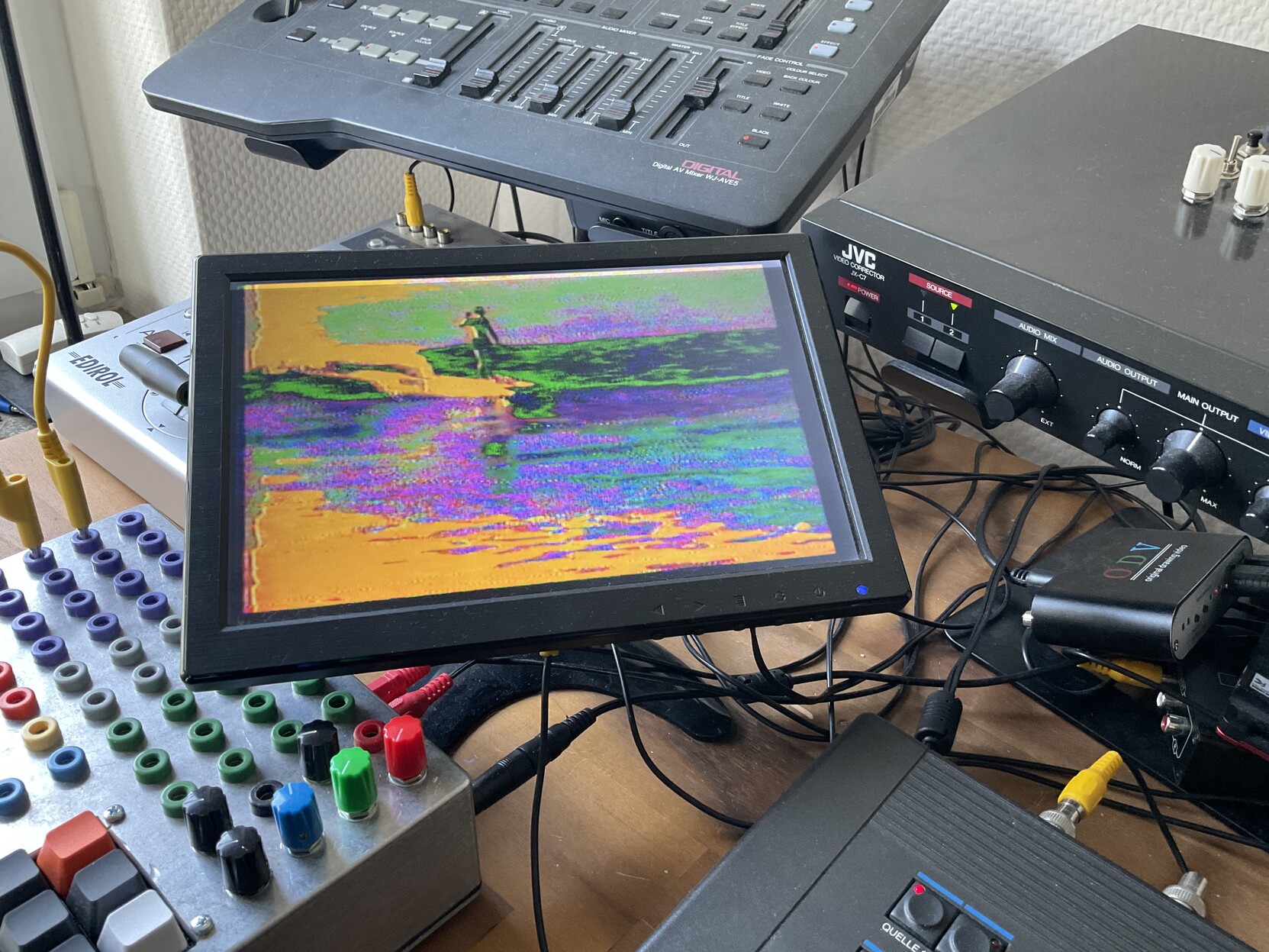 Video setup, as of yesterday evening: Panasonic WJ-AVE 5 mixer, Edirol V-4 mixer, circuit bent JVC JX-C7 Video Corrector, circuit bent Hama SE Processor 156. Not pictured: CRT TV under the table. #circuitbending #videobending #videoart #art #analoguevideo #hashtag