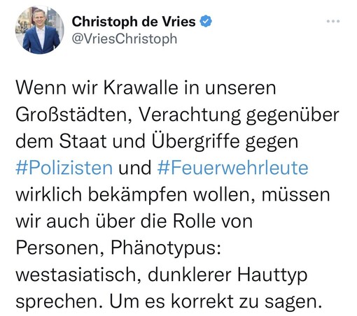 Wusstest ihr, dass CDU-MdB #Vries aufgrund von Hautfarbe oder Herkunftsland eure Straftaten erkennt.