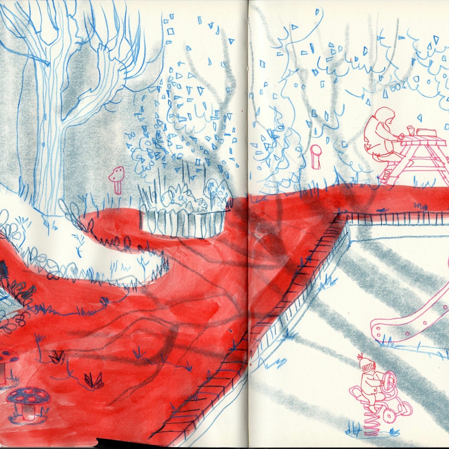 When I'm not doom scrolling, I mainly use social media to post and follow art and illustration, so here's a two colour sketch from a trip to the local playground. It was lovely and sunny and the tree shadows stretched out from behind me.
