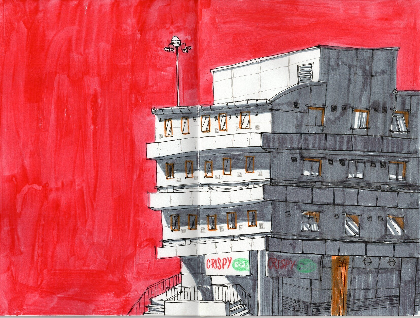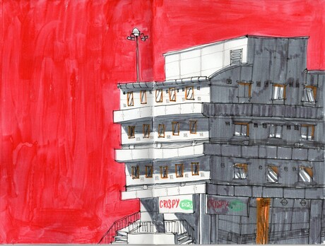 A sketch of the building across the street from the balcony of the Biscuit Factory in Reading. Alcohol markers and watercolour.