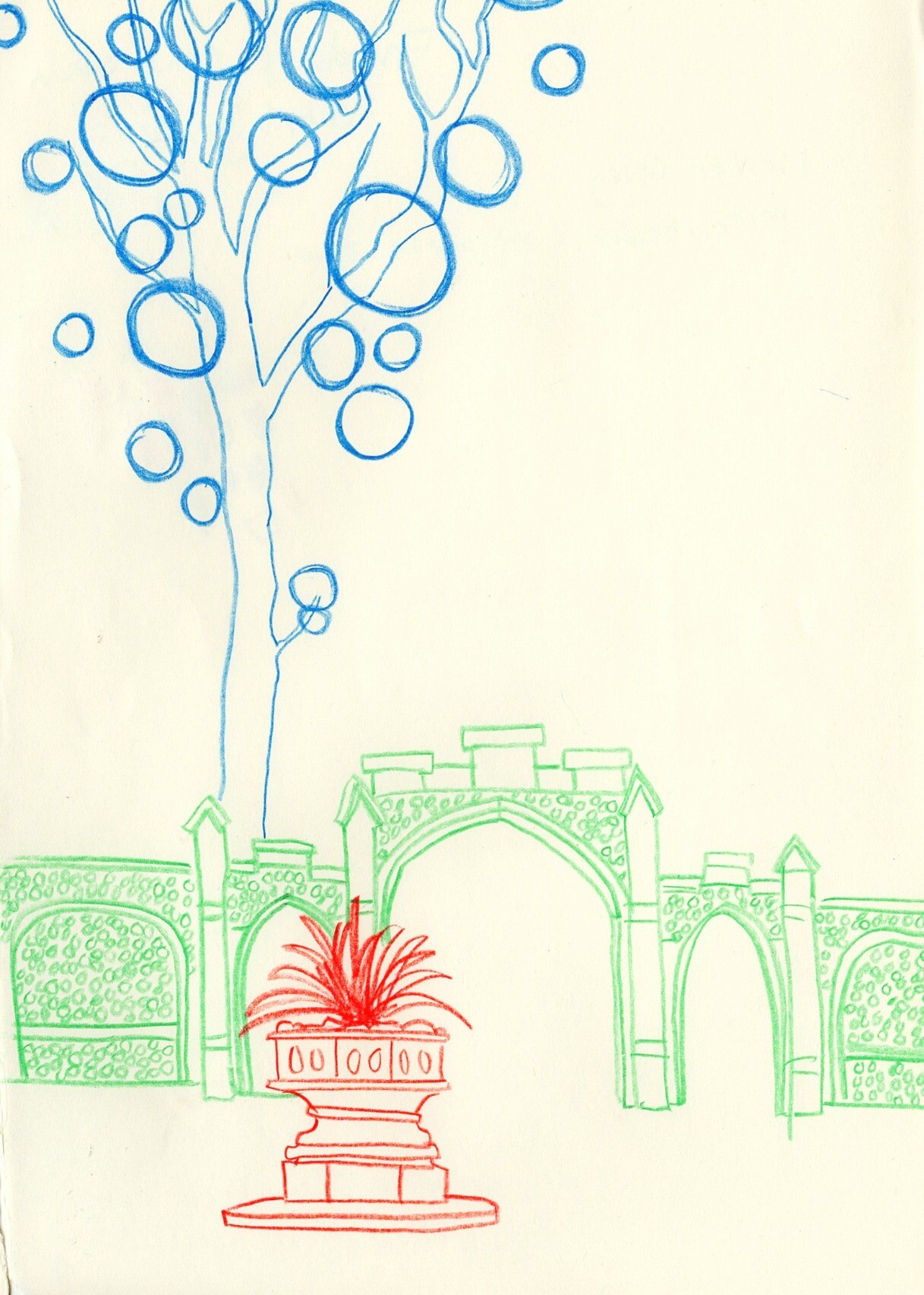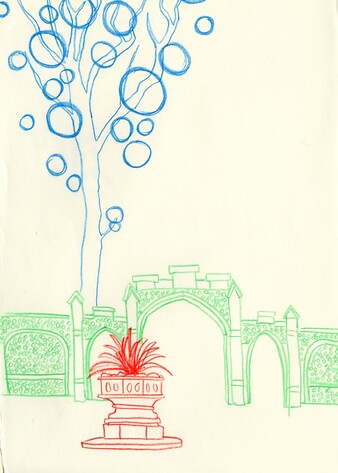 Line drawing in three colours at Caversham Court, in Reading. This is sat inside, looking out through the entrance archway. I always liked the trees outside with their balls of mistletoe.