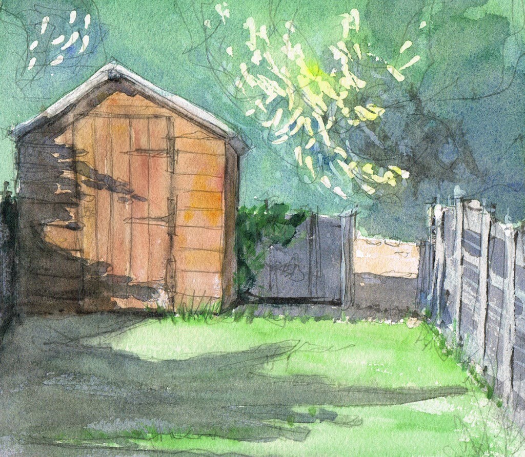 A watercolour sketch of my garden shed. I was feeling particularly inspired by John Singer Sargent so I tried out using wax resist (an old candle I found in a kitchen cupboard) on the background trees to get the light effect.