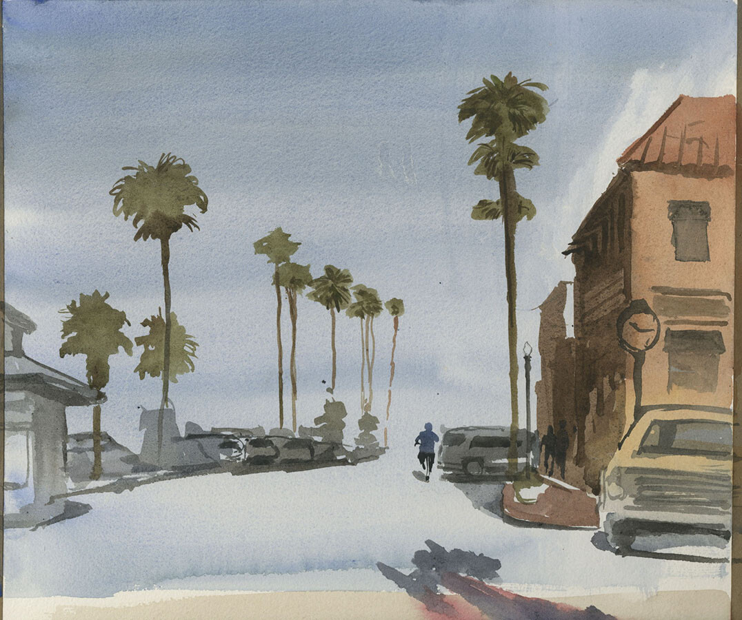 This was 2 days ago, beach vacation day 4.5. Sat in the town center and looked down the deserted boardwalk that had been so crowded on the day before. Yep, this place has palm trees. #watercolor #urbansketching