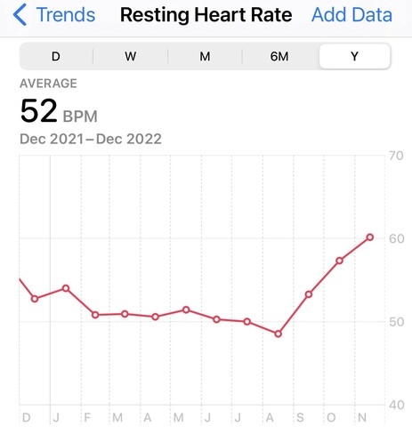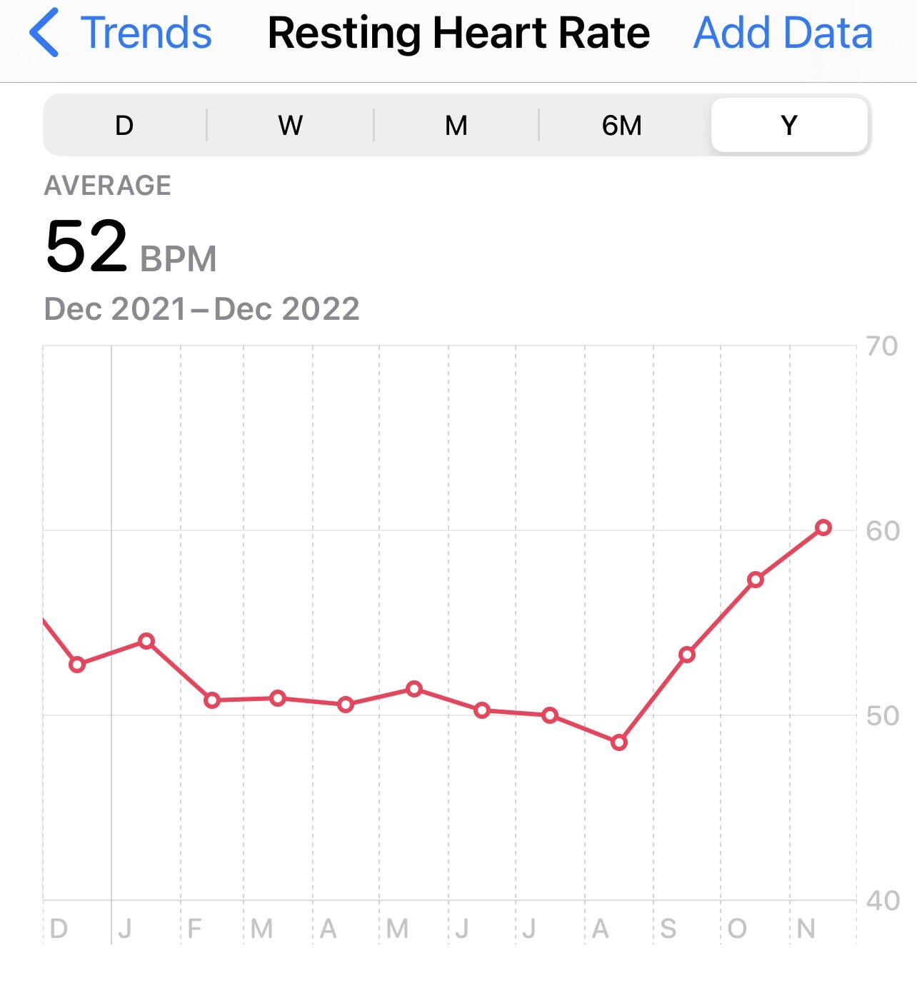 This is an amazing chart for what it says about #exercise and #wearables. I started training last November for a #cycling event I had this past September. I was riding 200+ miles a week on average. After I finished the event, I stopped cycling due to training fatigue. Amazing how in such a short period my resting heart rate spiked up. I am starting to train again and have lost so much fitness so quickly. Our bodies are all different. I feel so grateful for what I can do in mine.