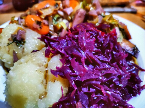 Es gibt Schweinebraten mit gefüllten Klößen (Speck) und Rotkohl.