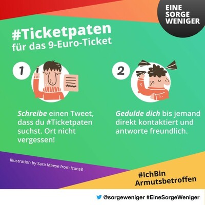 Du würdest gern das 9-Euro-Ticket nutzen und bist #IchBinArmutsbetroffen? Schreib’ einen Tweet mit dem Hashtag #Ticketpaten und deinem #Wohnort und freue dich über soldarische #Ticketpaten.