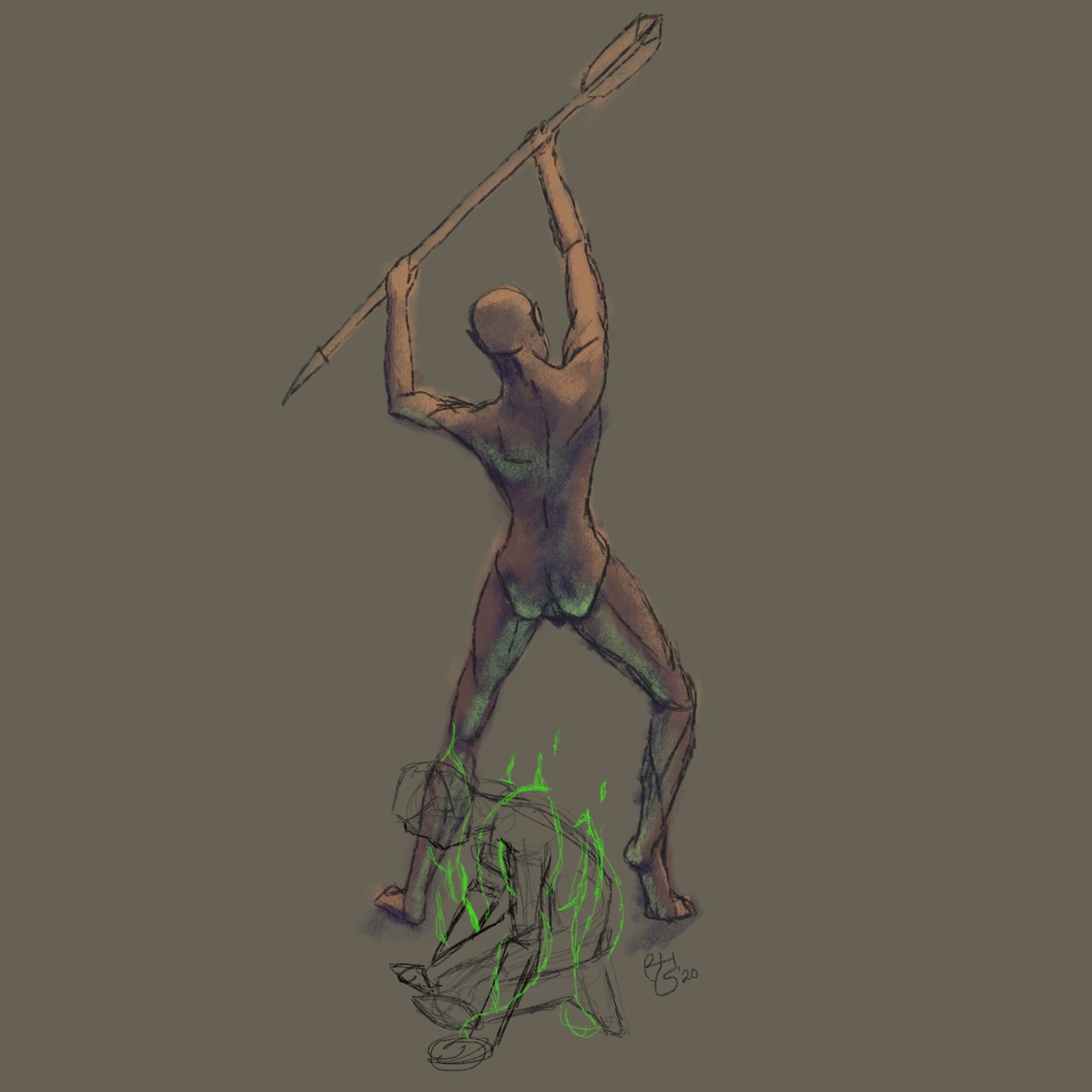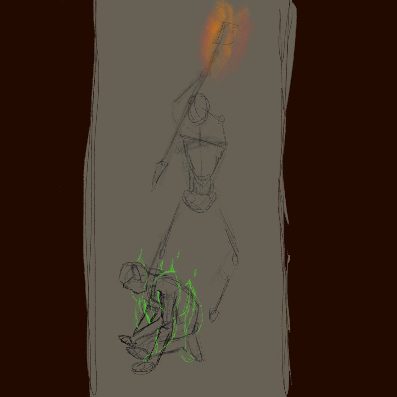 Working on a sketch of Solas defending Innè. I suppose I ought to give him clothes before I get too carried away drawing nude butt.