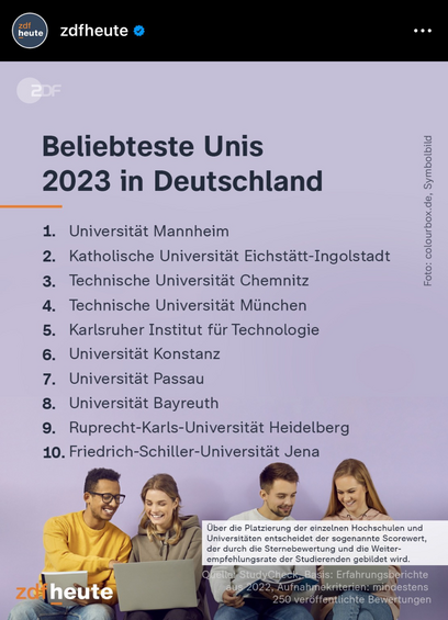 Laut Studycheck ist die @unimannheim Deutschlands beliebteste Universität 2023. 🥳🥳 Das berichtet ZDFheute via Instagram.