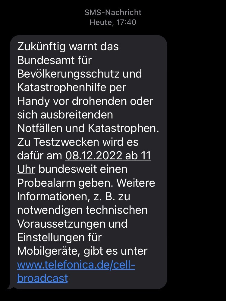 Jöij! Die #Cellbroadcast -SMS ist gekommen! Dann will ich am 08.12. aber auch Alarmparty auf allen Kanälen haben… 🚨