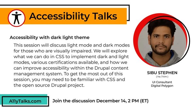 Join #A11yCat @sibustephen@twitter.com, UI consultant with Digital Polygon for Accessibility with dark light theme. We will discuss light mode and dark modes for those who are visually impaired.