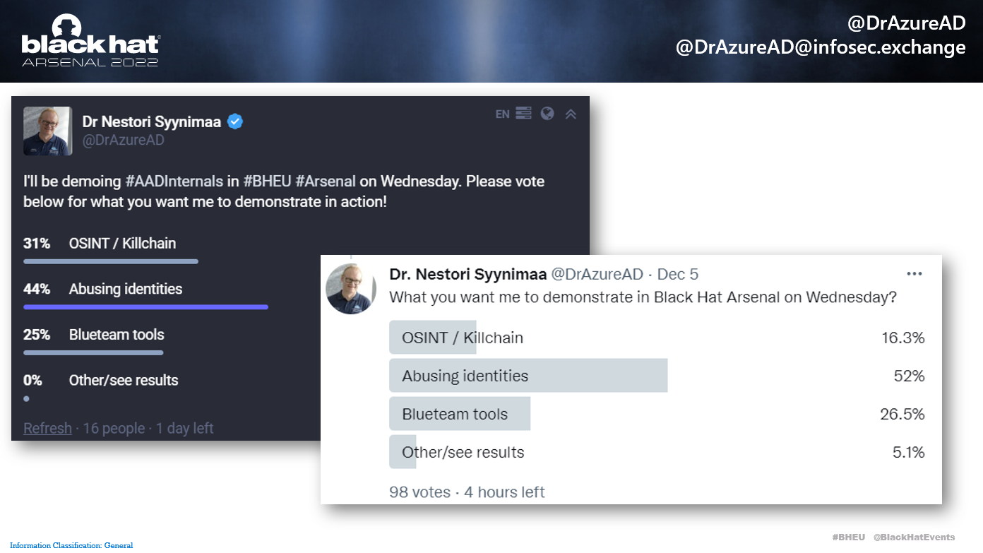 I'll be demoing #AADInternals in #BHEU #Arsenal on Wednesday. Please vote below for what you want me to demonstrate in action!