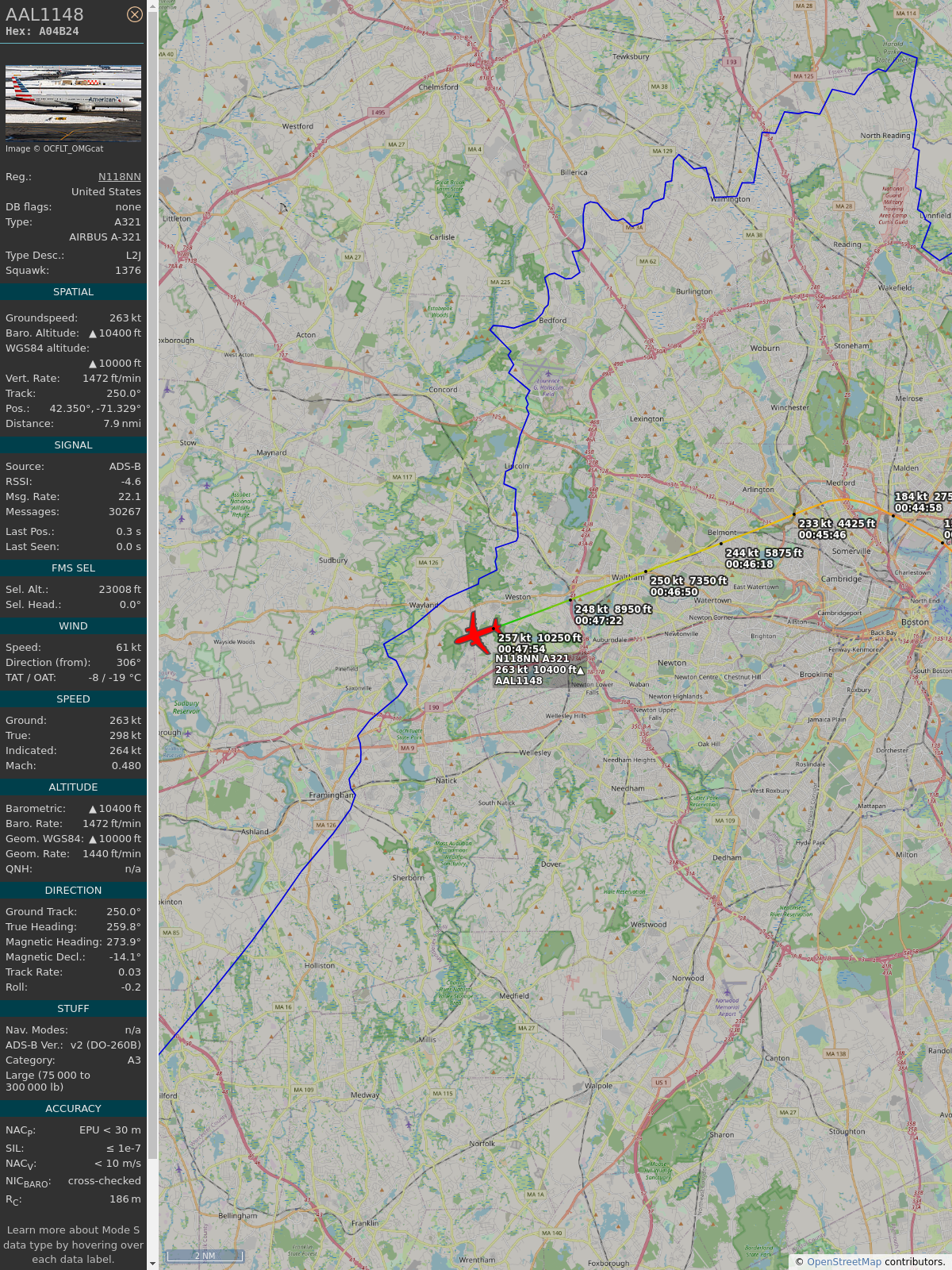 #KBOS / #KPVD - #AAL1148 (A321-231 A321) American Airlines @ 10575 ft and 28.8° frm hrzn, heading E @ 16:04:58 - https://globe.adsb.lol/?icao=A07B3E #adsb #AnyFlightTracker #rtmladsb #Boston Photo by: Mingfei S @ Planespotters.net
