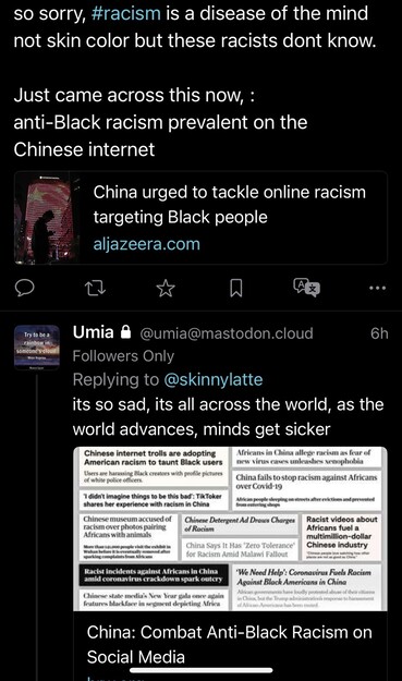 I shared something about how I encountered a racist incident in San Francisco and someone told me that China also has a problem with anti-Black racism. Which I agree with. But it’s a weird thing to say to a stranger?