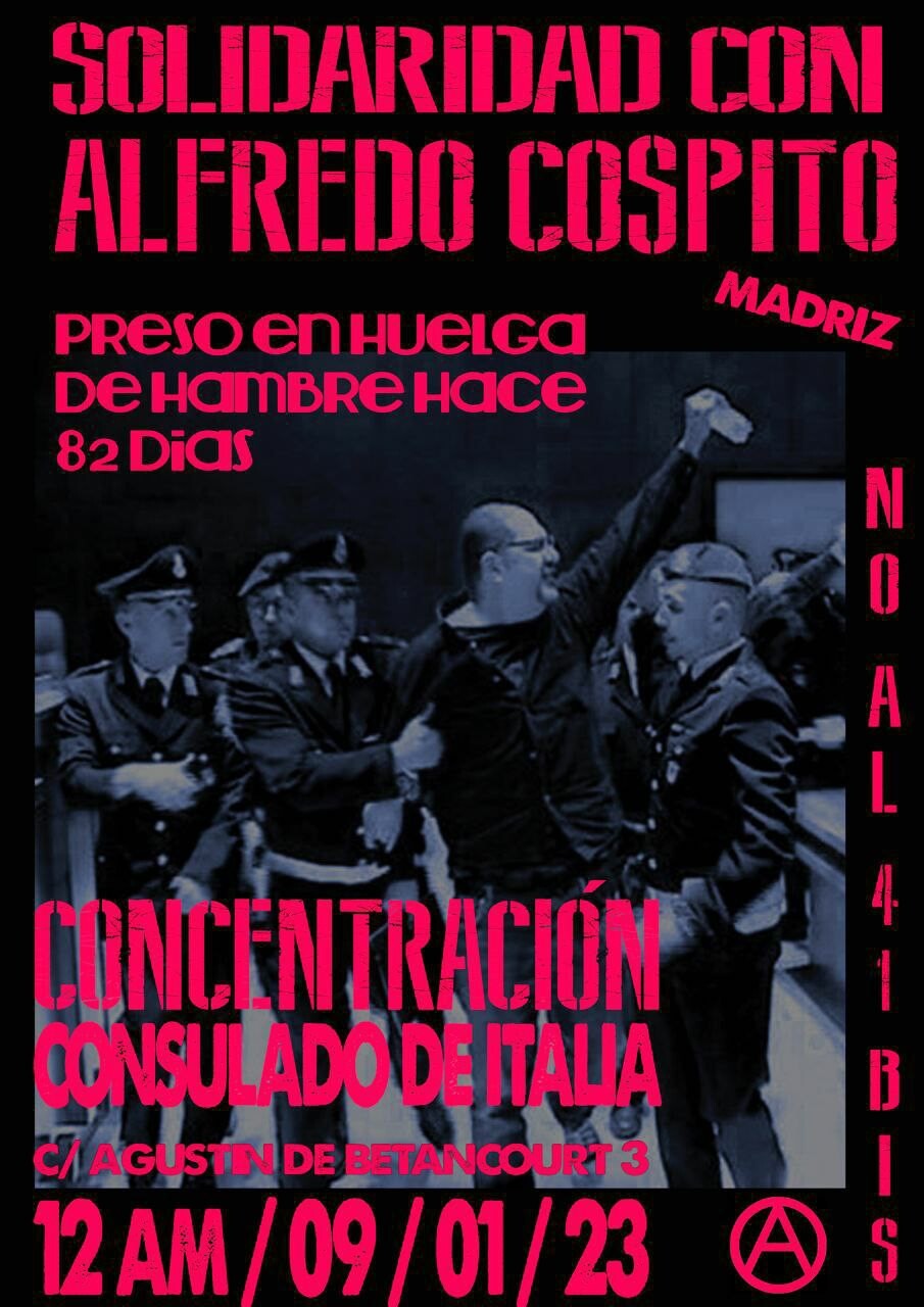 Cartel de la concentración ante el consulado italiano(c/ Agustín Betancourt,3) en Madrid el 9/01 a las 12h en apoyo al prisionero anarquista A.Cospito en huelga de hambre contra su régimen de aislamiento y el fin de esa práctica