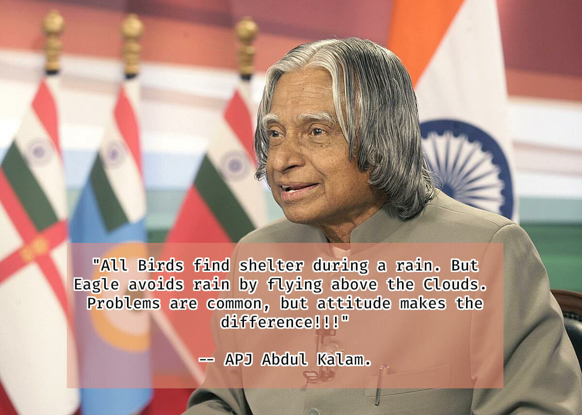 "All Birds find shelter during a rain. But Eagle avoids rain by flying above the Clouds. Problems are common, but attitude makes the difference!!!"