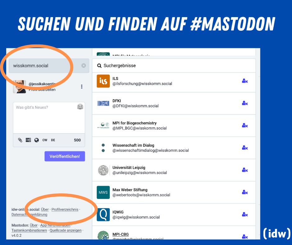 1. Tipp: Mittlerweile haben sich über 80 Nutzer:innen auf der Instanz https://wisskomm.social angemeldet. Sie können diese ganz einfach finden und gerne #abonnieren, indem Sie ins Suchfeld @wisskomm.social eingeben. Auf der eigenen Instanz kann man andere Nutzer:innen finden, indem man unten links auf Profilverzeichnis klickt. 👇