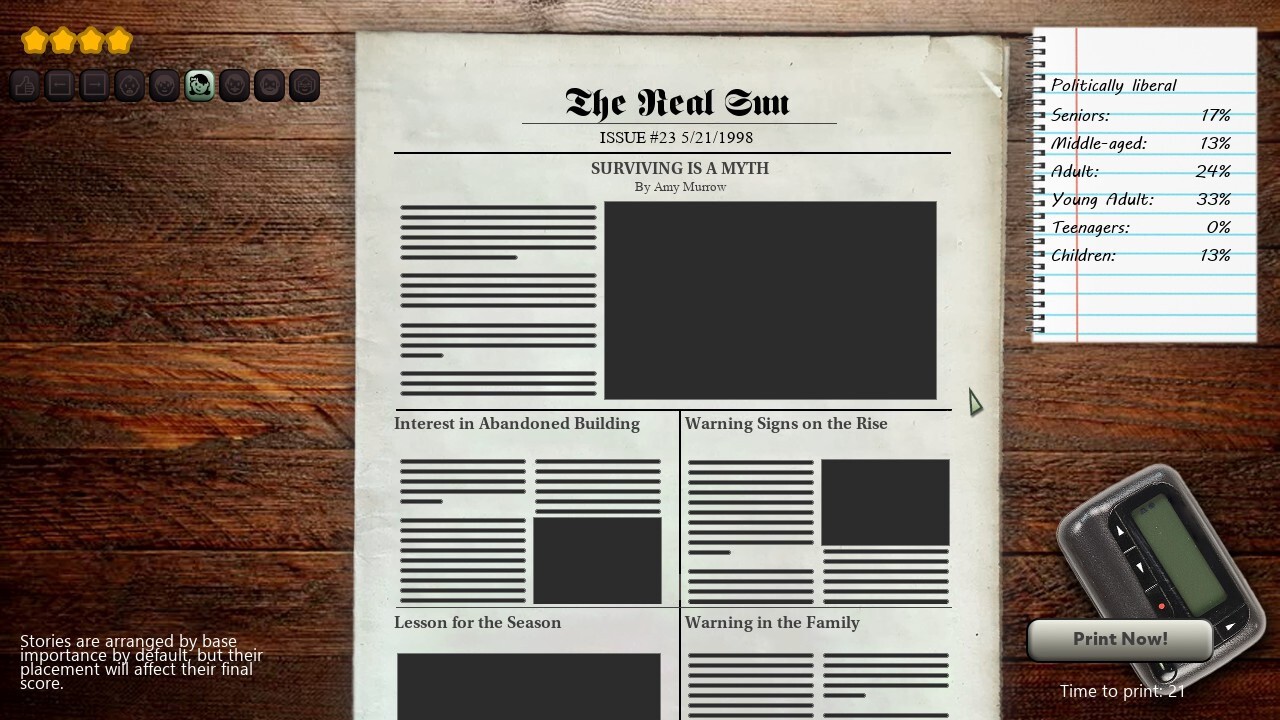 In #AboveTheFold you build and manage your mass media outlet. Choose your politics, hire reporters, find advertisements and stories that match your goals.