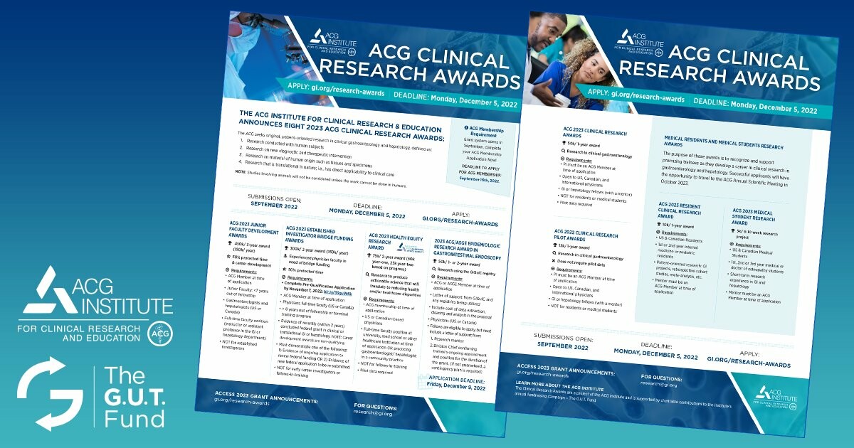 ⏰ Time is running out to apply for a 2023 #ACGInstitute Clinical Research Award! 8 award types w/ opportunities for all career stages, from med students to experienced investigators