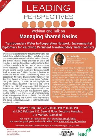 An academic talk in #Islamabad, #Pakistan and via webinar on environmental diplomacy and water conflicts given by Professor Asim Zia (my husband) on Thursday at 6 am EDT (New York City time). He will cover #Kabul, #Indus, #Jordan, #Missisquoi, and #Kali Rivers