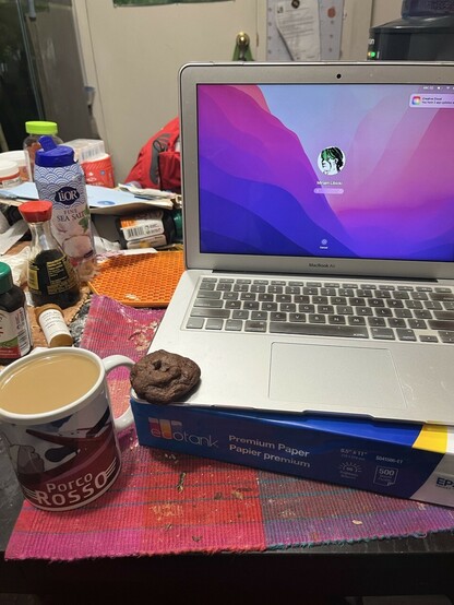 Got my work-attitude mug, a chocolate cookie made by my son, and my laptop at typing height. Got two new-to-me albums bought and downloaded. Let’s craft that academic application package!!! #AdjunctLife #PorcoRosso #today