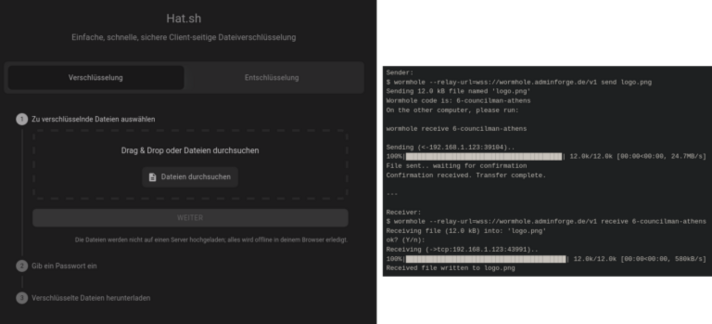 1) Hat.sh ist eine Webanwendung, die eine sichere lokale Dateiverschlüsselung im Browser ermöglicht. Sie ist schnell, sicher und verwendet moderne kryptografische Algorithmen mit Chunked-AEAD-Stream-Verschlüsselung/Entschlüsselung.