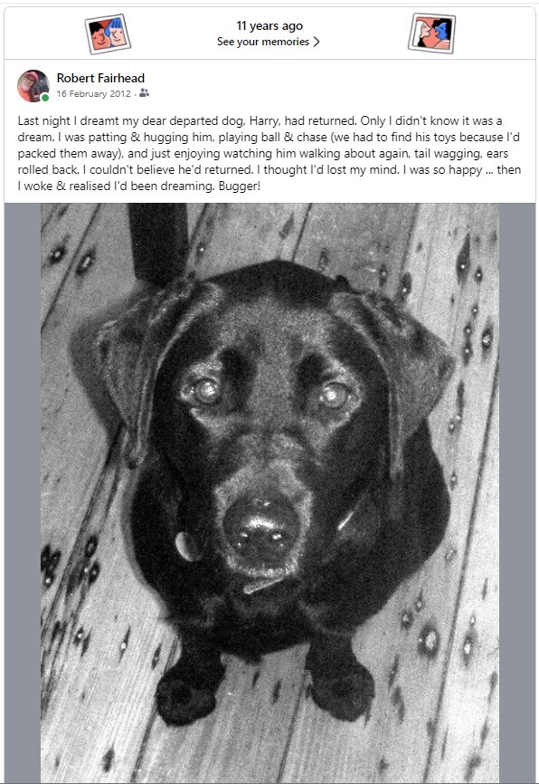 This 2012 post popped up in my Facebook timeline memories this morning. My dreams of Harry, who passed away in 2011, continued for a couple of years but faded after I adopted Jet. Coincidentally, we'll be celebrating his 11th #Adoptaversary in March. ❤ #dogs #MyDogs #MyDogPosts #DogsOfMastodon