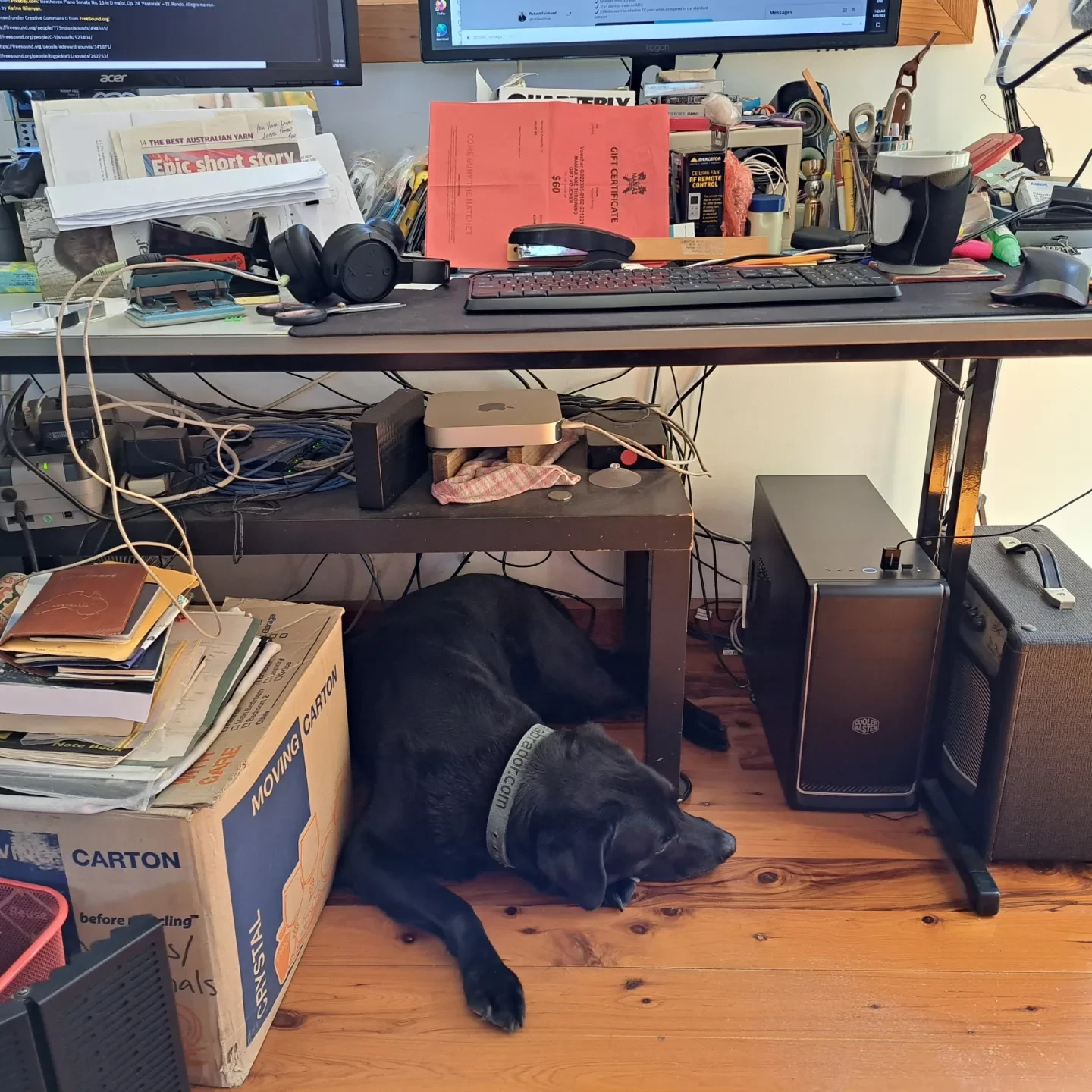 For some reason, Jet's decided to flop under my desk today, making it difficult to get my legs under it for comfortable writing. But it's his 9th #Adoptaversary, so I'm spoiling him and tucking my legs under my chair. ❤️ #dogs #MyDog #RescueDog #MyDogPosts #DogsOfMastaodon