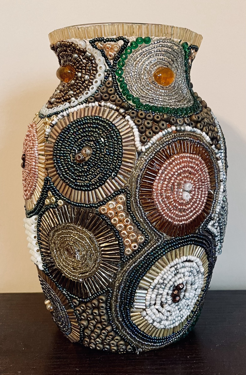 Autumn Aggregate vase, 2022. Preowned vase and bead mosaic using a mixture of new and salvaged beads. Went to its new home with the collector last night.