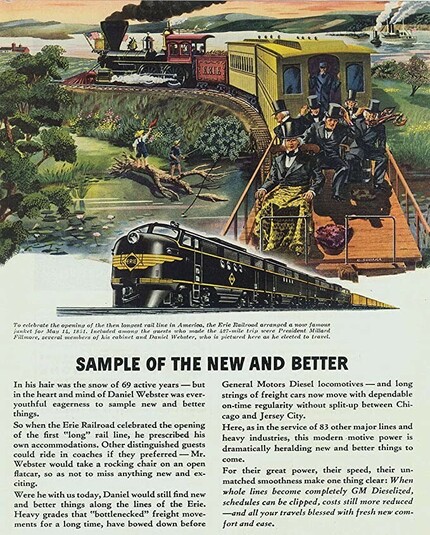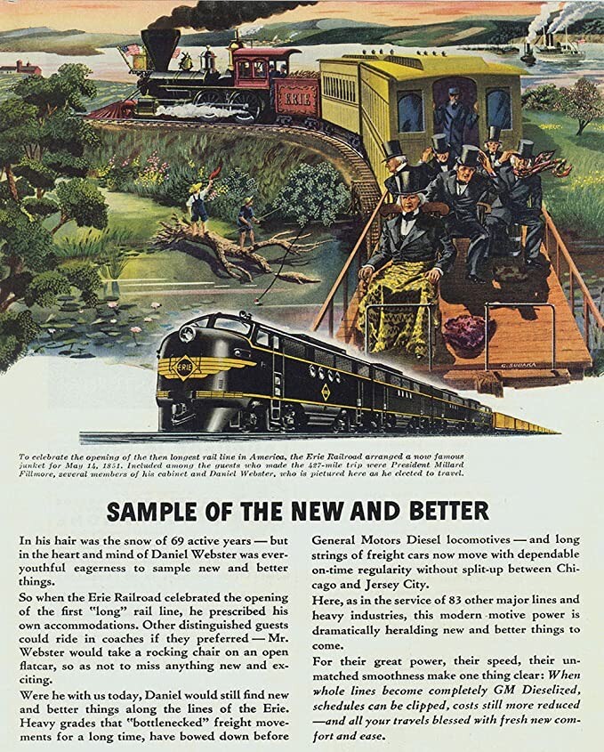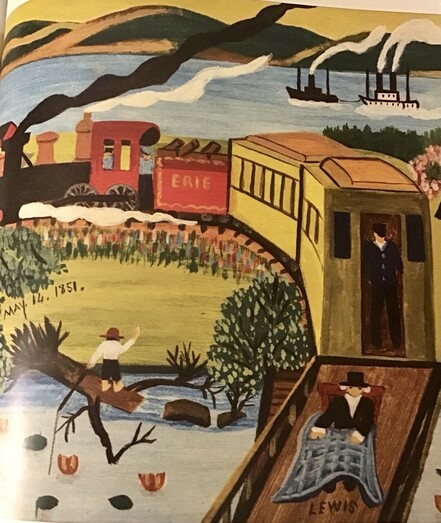 Maud turns the Erie Railroad ad into a painting in her own style. #MaudLewis #FolkArt #ArtGalleryNovaScotia #AdvertisingArt