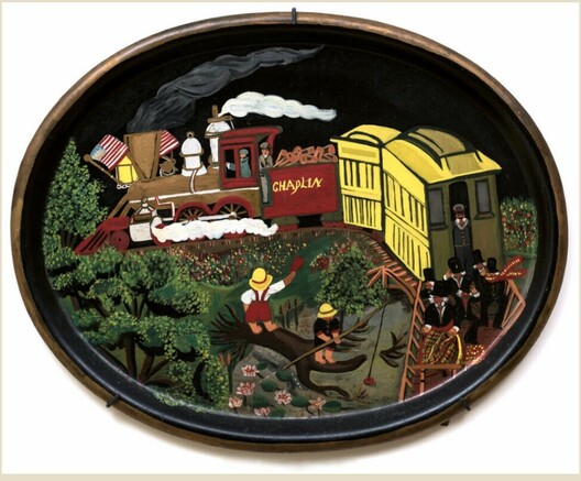 Maud paints the train again, this time on a tray and changing it from “Erie” to “Chaplin.” #MaudLewis #FolkArt #ArtGalleryNovaScotia #AdvertisingArt