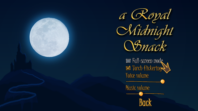 Minor update for #AdvJam2023 entry "a Royal Midnight Snack", with some bugfixes and adding a settings menu to help better balance the sound levels or to disable the torch flickering for people who are annoyed by or sensitive to it. https://shdon.itch.io/royal-midnight-snack