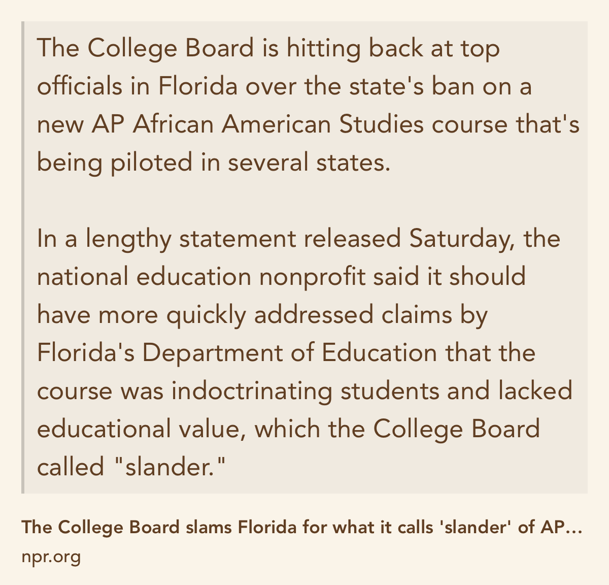 It’s remarkable to read the #CollegeBoard’s statement about their interactions with #Florida’s Department of #Education. Definitely read the whole thing, but here’s just one quote: