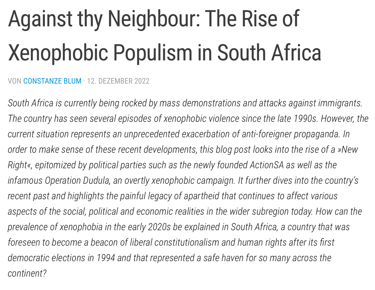 Blog post by @ConstanzeBlum on the „The Rise of Xenophobic Populism in South Africa“