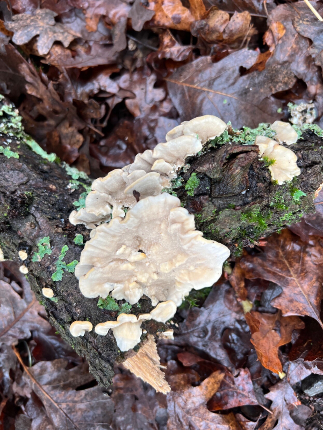 Mushroom experts help me out! What kind of mushroom is covering this branch that dropped from the oak tree above it? I’m enchanted by its’ frilly edges all decked out for a party! #afterthestorm #mushrooms