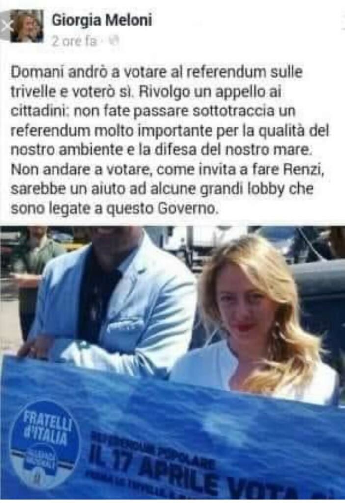 Ha vinto anche per la coerenza. Poi, quando si arriva a Palazzo Chigi, sulle trivelle e le lobby amiche di Renzi improvvisamente si cambia idea...