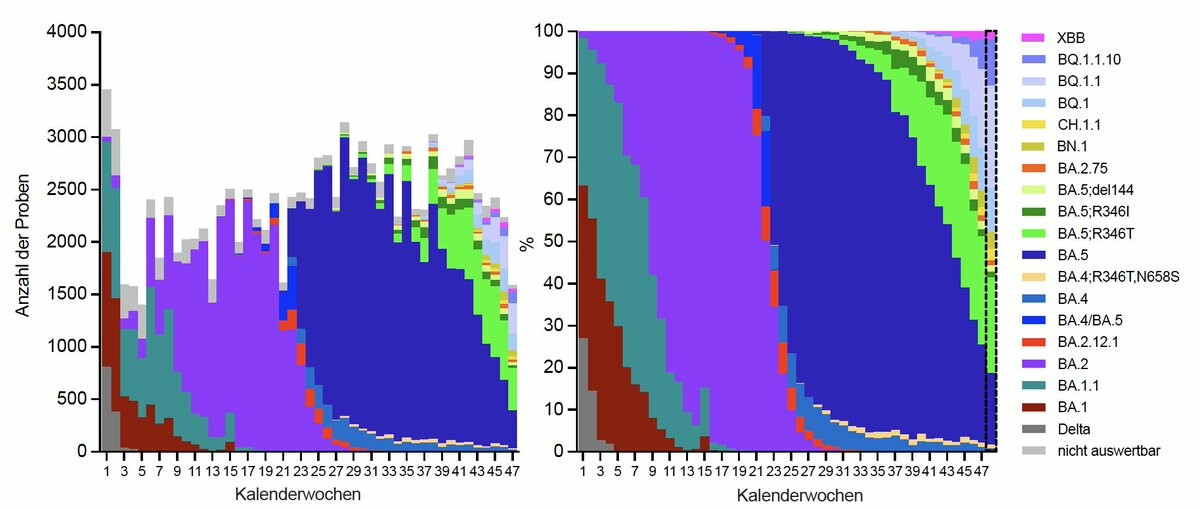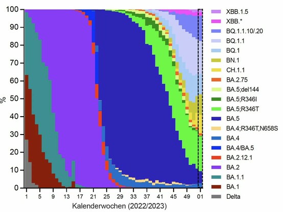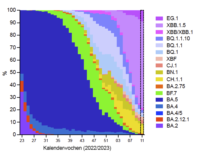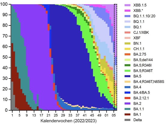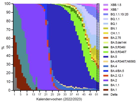 🇦🇹 Representative genomic surveillance of SARS-CoV-2 in Austria in the first week of 2023 across most regions. Dashed box is nowcasting. A collaboration of #AGES @agesnews and @IMBA_Vienna/@oeaw.