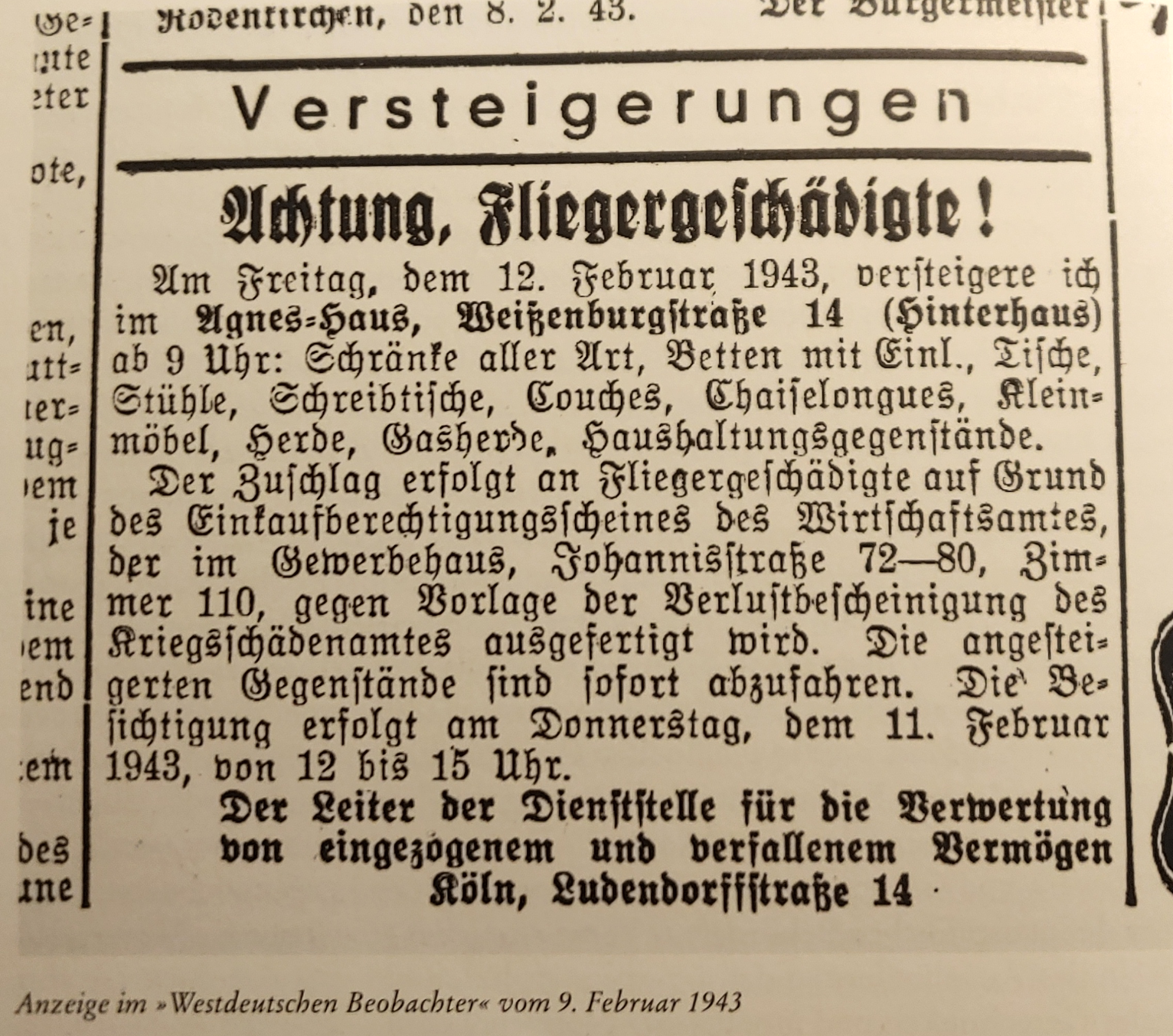 Ankündigung einer Zwangsversteigerung der Dienststelle "für die Verwertung von eingezogenen und verfallenem Vermögen Köln" im Agnes-Haus, Weißenburgstraße 14.