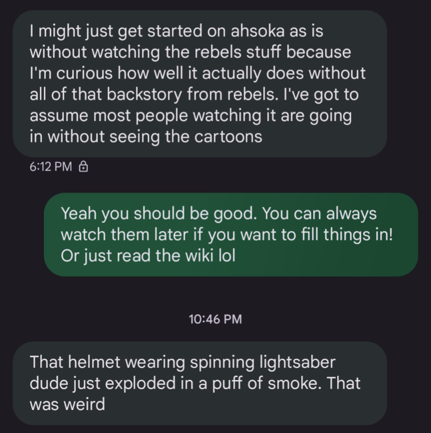 WARNING, SPOILERS AHEAD. I used the content warning and an obnoxious all-caps warning, you can’t complain about me spoiling things! I will *also* tag everything in the thread #Ahsoka, #spoilers, and #AhsokaSpoilers as much as I can.
