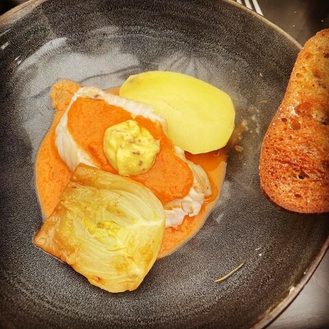 Aujourd’hui pavé de vieille fenouil braisé pomme de terre accompagné d’une sauce tomate@fumet de poisson épicée sans où lier un aïoli maison #bouffe #food #poisson #aioli #miamtodon