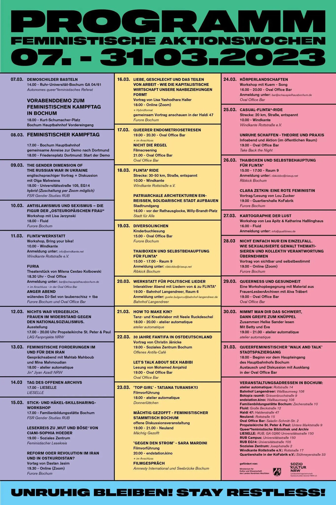 Das Programm der feministischen Aktionswochen 2023 ist online. Zwischen dem 7. und 31. März werden 35 Termine angekündigt. Zu fast allen Veranstaltungen gibt es bereits nähere Erläuterungen: